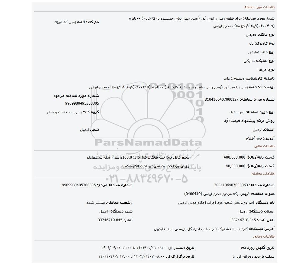 مزایده قطعه زمین زراعی آبی (زمین چمن یولی چسبیده به کارخانه ) 8۰۰م م (۰۴۰۰۴۱۹)قریه آقبلاغ مالک محرم ایرانی, مزایده، قطعه زمین زراعی آبی (زمین چمن یولی چسبیده به کارخانه ) 8۰۰م م (۰۴۰۰۴۱۹)قریه آقبلاغ مالک محرم ایرانی