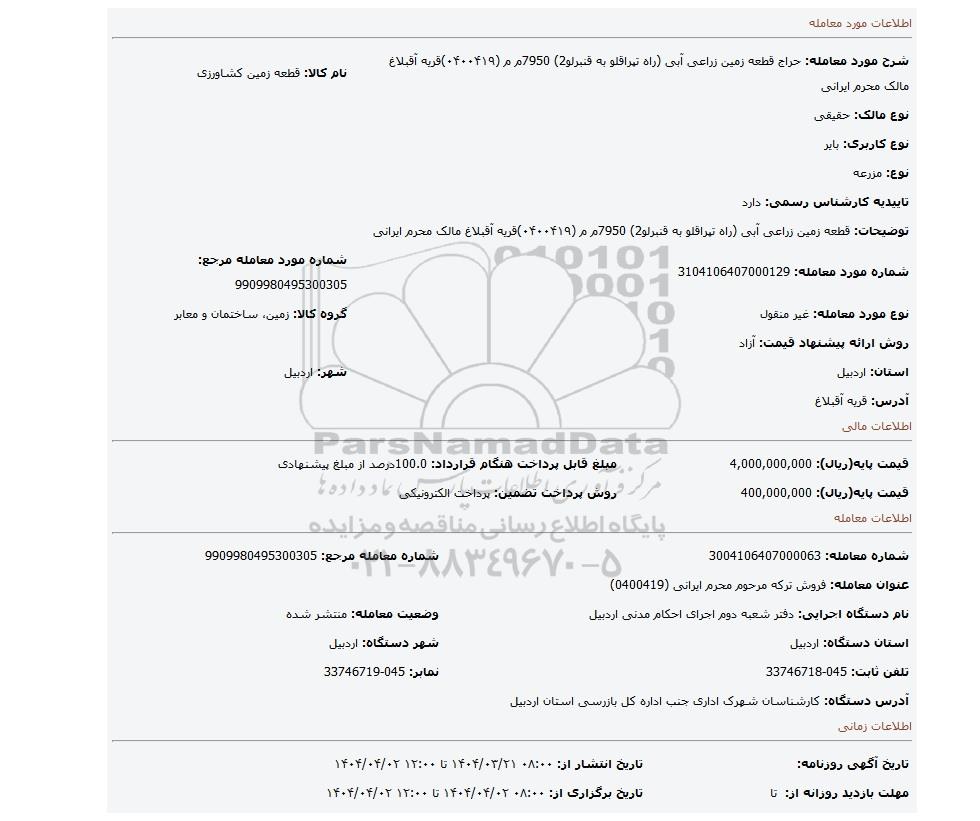 مزایده، قطعه زمین زراعی آبی  (راه تپراقلو  به قنبرلو2) 7950م م (۰۴۰۰۴۱۹)قریه آقبلاغ مالک محرم ایرانی