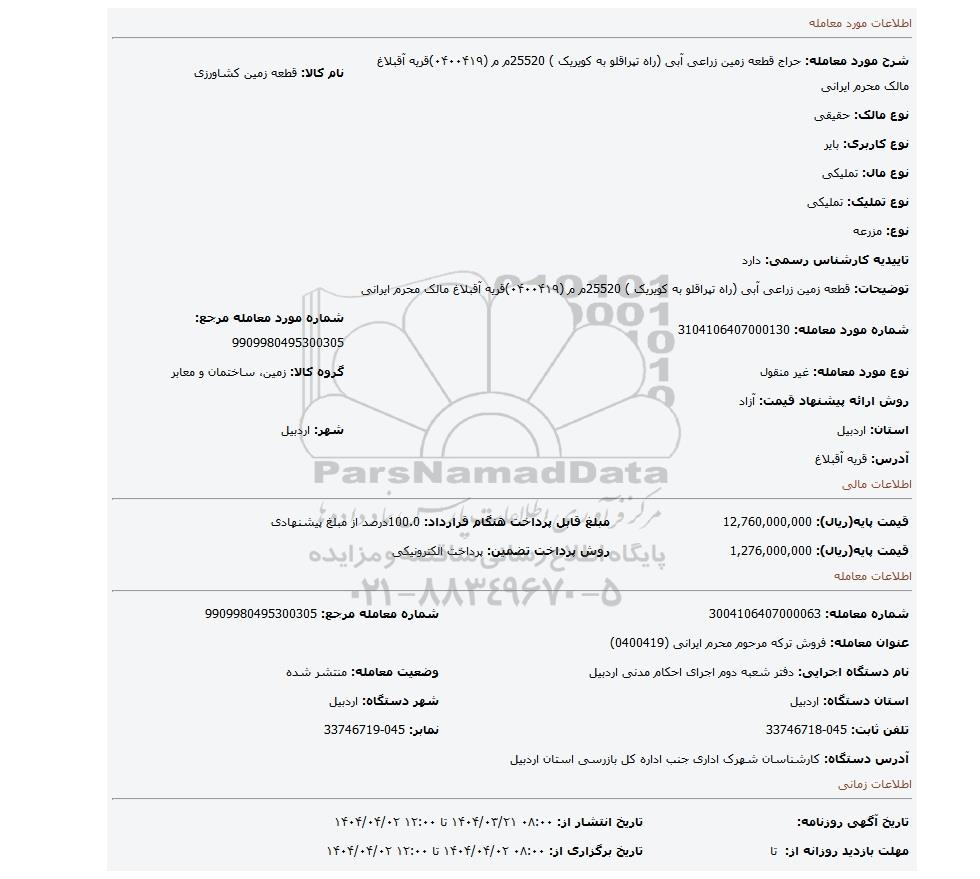 مزایده، قطعه زمین زراعی آبی  (راه تپراقلو به کویریک ) 25520م م (۰۴۰۰۴۱۹)قریه آقبلاغ مالک محرم ایرانی