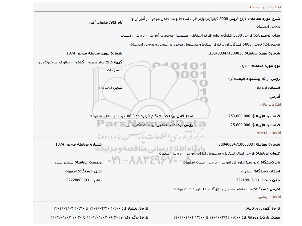 | عنوان معامله: فروش اموال اسقاط و مستعمل ادارات آموزش و پرورش اصفهان | ||