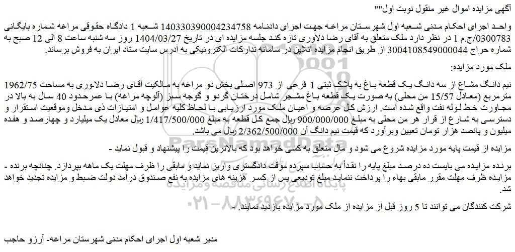 واحد اجرای احکام مدنی شعبه اول شهرستان مراغه جهت اجرای دادنامه 140330390004234758 شعبه 1 دادگاه حقوقی مراغه شماره بایگانی 0300783/ج.م 1 در نظر دارد ملک متعلق به آقای رضا دلاوری تازه کند جلسه مزایده ای در تاریخ 1404/03/27 روز سه شنبه ساعت 8 الی 12 صبح به شماره حراج 3004108549000044 از طریق انجام مزایده آنلاین در سامانه تدارکات الکترونیکی به آدرس سایت ستاد ایران به فروش برساند.