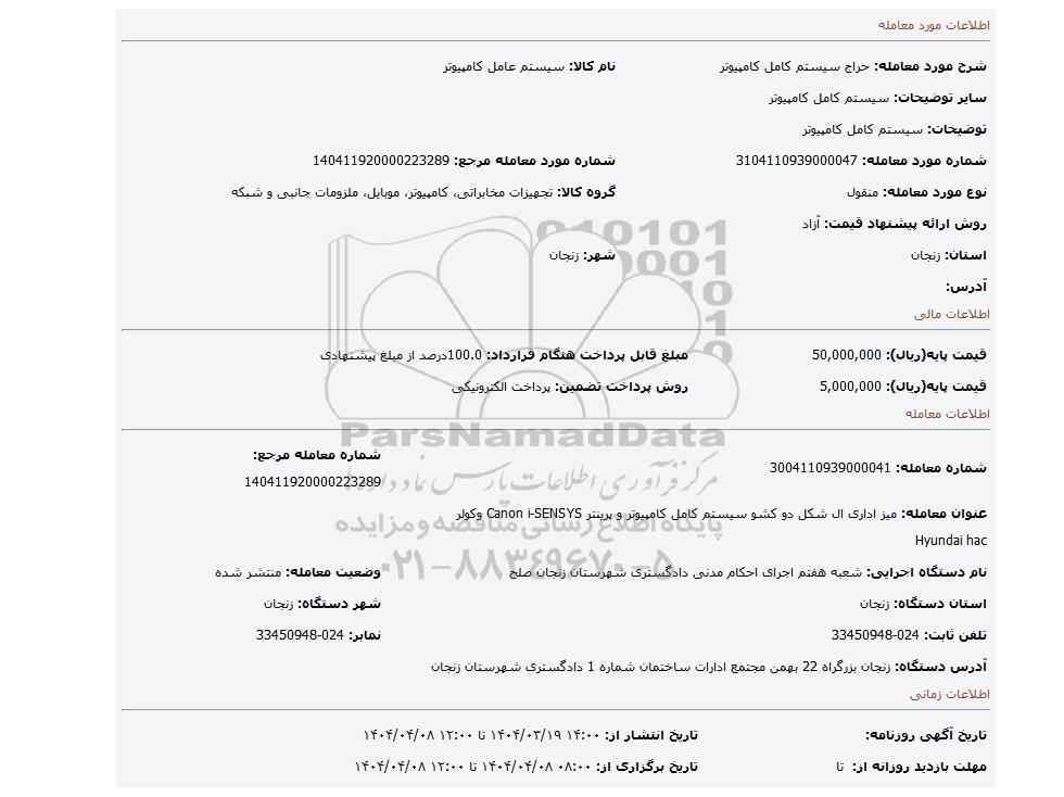 مزایده عمومی مزایده سیستم کامل کامپیوتر برگزار میگردد. از کلیه افراد متخصص و شرکت‌های واجد شرایط دعوت به عمل می‌آید تا در این مزایده با کد خبرگزاری پارس نماد : 9164556 شرکت نمایند تاریخ شروع مزایده : 1404/03/19 مهلت شرکت در مزایده: تا پایان روز 1404/04/08 مکان برگزاری اموال واگذاری استان‌های زنجان و دسته‌بندی‌های مربوط به این حراجی کامپیوتر میباشد.