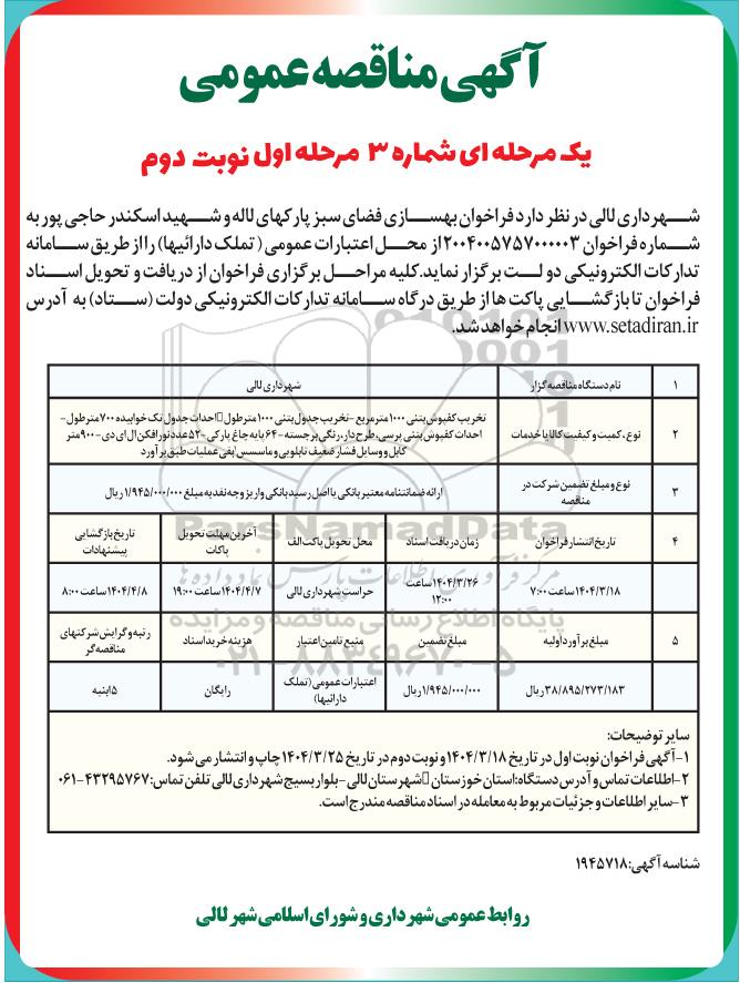 شهرداری لالی در نظر دارد فراخوان بهسازی فضای سبز پارکهای لاله و شهید اسکندر حاجی پور به شماره 2004005757000003 از محل اعتبارات عمومی (تملک داراییها) را از طریق سامانه تدارکات الکترونیکی دولت برگزار نماید. کلیه مراحل برگزاری فراخوان از دریافت و تحویل اسناد فراخوان تا بازگشایی پاکتها از طریق درگاه سامانه تدارکات الکترونیکی دولت (ستاد)به آدرس سایت ستاد ایران انجام خواهد شد.