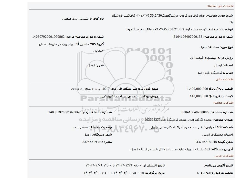 مزایده فرقنادی گردون مرشدگوهر30.2*30.2 (۰۳۰۲۸۳۷)بامالکیت فروشگاه رفا, مزایده، فرقنادی گردون مرشدگوهر30.2*30.2 (۰۳۰۲۸۳۷)بامالکیت فروشگاه رفا