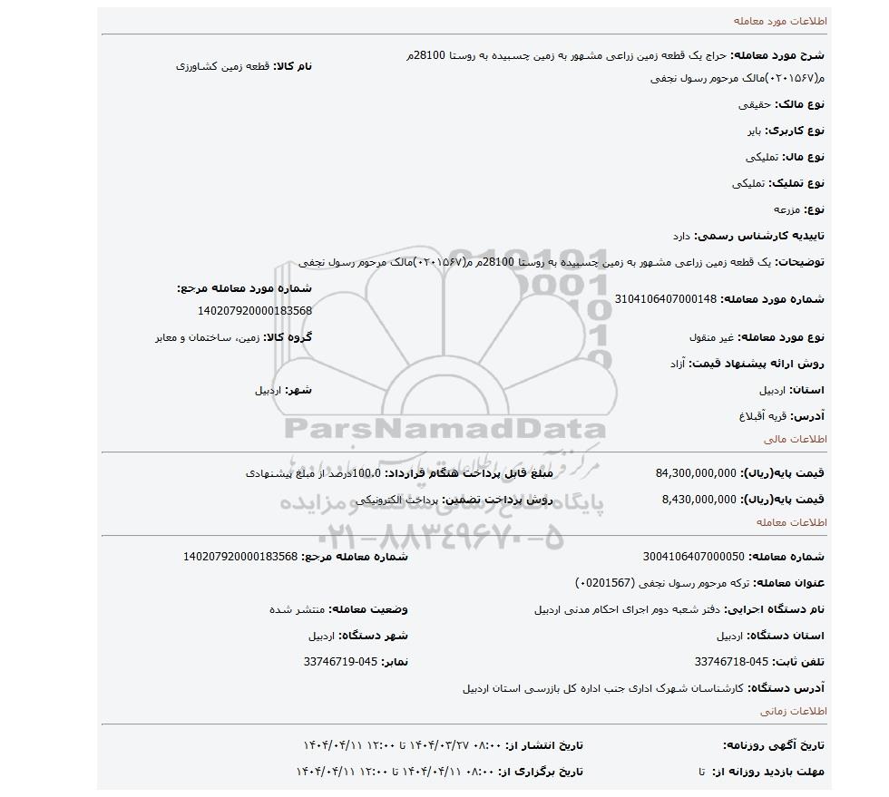 شرح مورد معامله: حراج یک قطعه زمین زراعی مشهور به زمین چسبیده به روستا 28100م م(۰۲۰۱۵۶۷)مالک مرحوم رسول نجفی | نام کالا: قطعه زمین کشاورزی | |