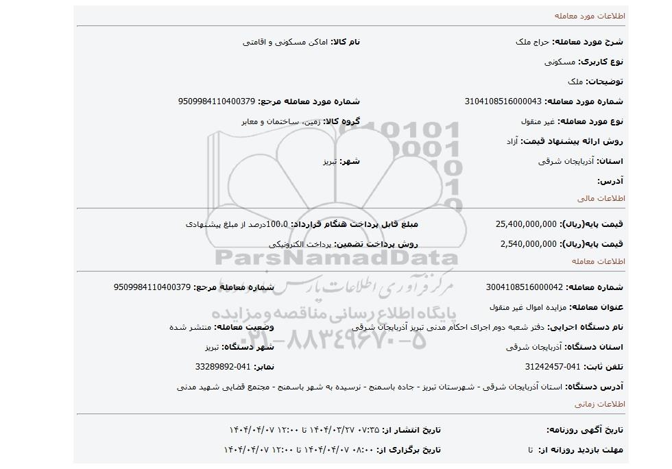 | شرح مورد معامله: حراج ملک | نام کالا: اماکن مسکونی و اقامتی | |