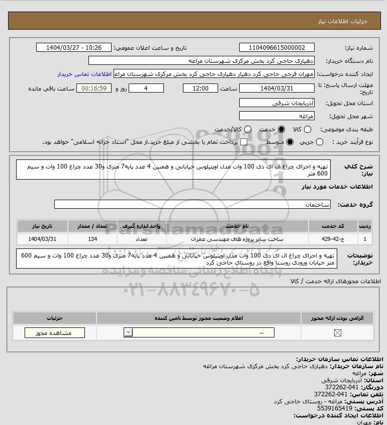 توضیحات خریدار:تهیه و اجرای چراغ ال ای دی 100 وات مدل اوپتیلوس خیابانی و همنین 4 عدد پایه7 متری و30 عدد چراغ 100 وات و سیم 600 متر خیابان ورودی روستا واقع در روستای حاجی کرد
