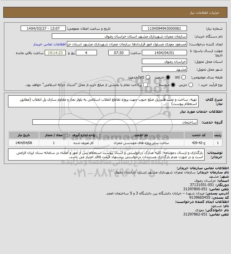 نام دستگاه خریدار:سازمان عمران شهرداری مشهد استان خراسان رضوی