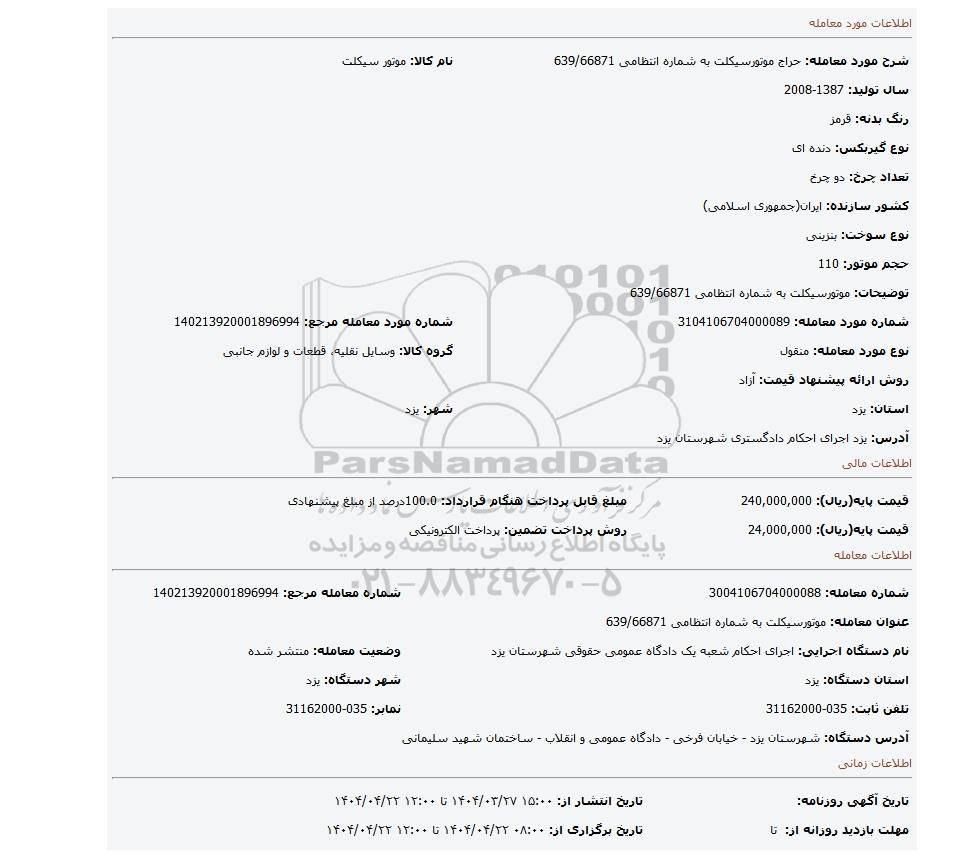مزایده، موتورسیکلت به شماره انتظامی 639/66871