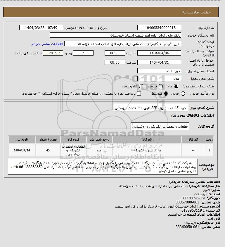 شرح کلی نیاز: خرید 45 عدد ماژول SFP طبق مشخصات پیوستی