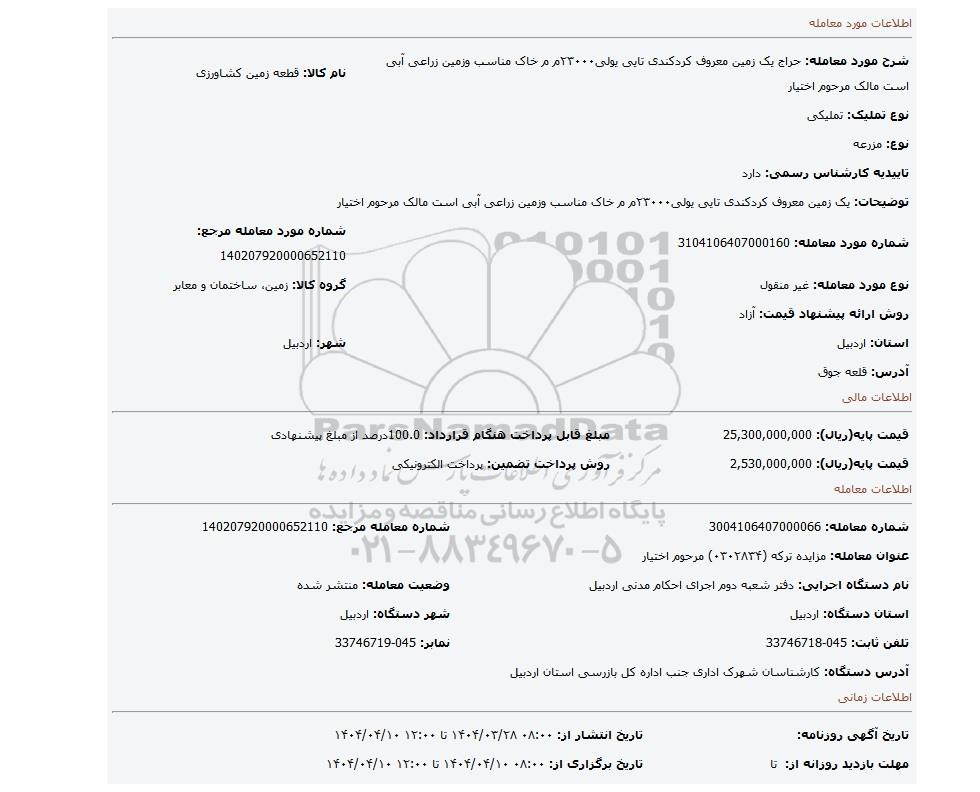 شرح مورد معامله: حراج یک زمین معروف کردکندی تایی یولی۲۳۰۰۰م م خاک مناسب وزمین زراعی آبی است مالک مرحوم اختیار | نام کالا: قطعه زمین کشاورزی | |