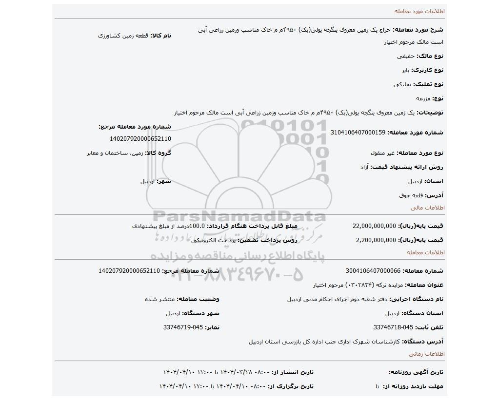شرح مورد معامله: حراج یک زمین معروف ینگجه یولی(یک) ۴۹۵۰م م خاک مناسب وزمین زراعی آبی است مالک مرحوم اختیار | نام کالا: قطعه زمین کشاورزی | |