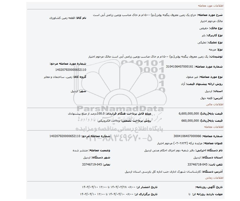 مزایده عمومی مزایده یک زمین معروف ینگجه یولی(دو) ۱۵۰۰م م خاک مناسب وزمین زراعی آبی است مالک مرحوم اختیار برگزار میگردد. از کلیه افراد متخصص و شرکت‌های واجد شرایط دعوت به عمل می‌آید تا در این مزایده با کد خبرگزاری پارس نماد : 9172187 شرکت نمایند تاریخ شروع مزایده : 1404/03/28 مهلت شرکت در مزایده: تا پایان روز 1404/04/10 مکان برگزاری اموال واگذاری استان‌های اردبیل و دسته‌بندی‌های مربوط به این حراجی املاک و زمین میباشد. اطلاعات دقیق‌تر درباره شرایط شرکت در مزایده آنلاین و نحوه ارسال مدارک، الزامات پروژه و دریافت اسناد مزایده و تاریخ بازگشایی پاکت‌ها، در بخش اطلاعات تکمیلی این آگهی درج شده است.