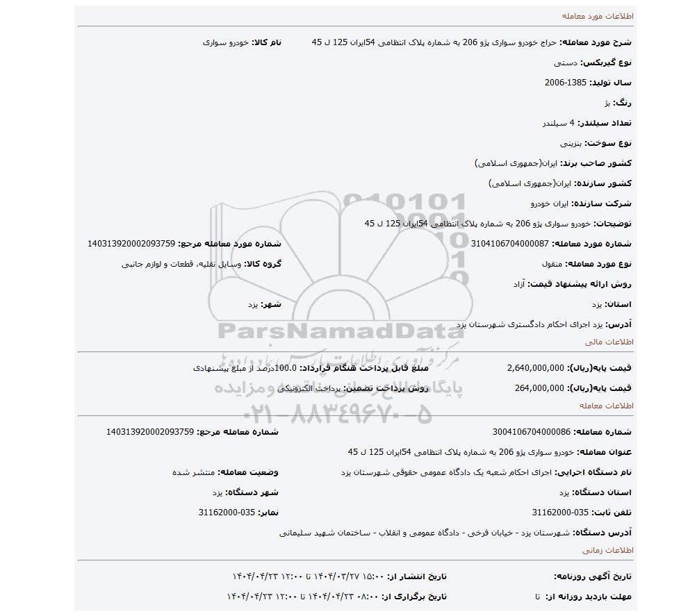 عنوان معامله: خودرو سواری پژو 206 به شماره پلاک انتظامی 54ایران 125 ل 45
