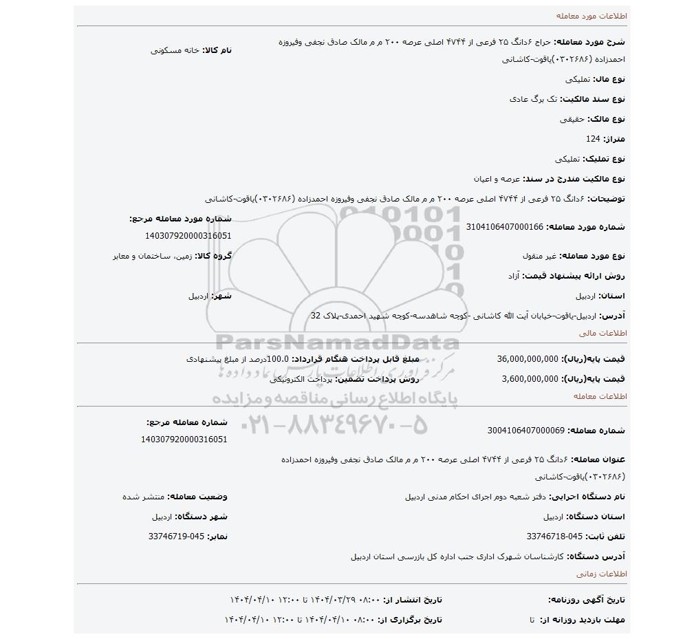 مزایده عمومی مزایده ۶دانگ ۲۵ فرعی از ۴۷۴۴ اصلی عرصه ۲۰۰ م م مالک صادق نجفی وفیروزه احمدزاده (۰۳۰۲۶۸۶)یاقوت-کاشانی برگزار میگردد. از کلیه افراد متخصص و شرکتهای واجد شرایط دعوت به عمل میآید تا در این مزایده با کد خبرگزاری پارس نماد : 9175577 شرکت نمایند تاریخ شروع مزایده : 1404/03/29 مهلت شرکت در مزایده: تا پایان روز 1404/04/10