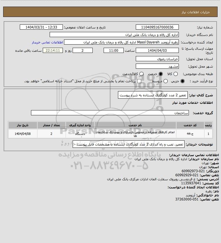 شرح کلی نیاز: تعمیر 2 عدد کولرگازی ایستاده به شرح پیوست