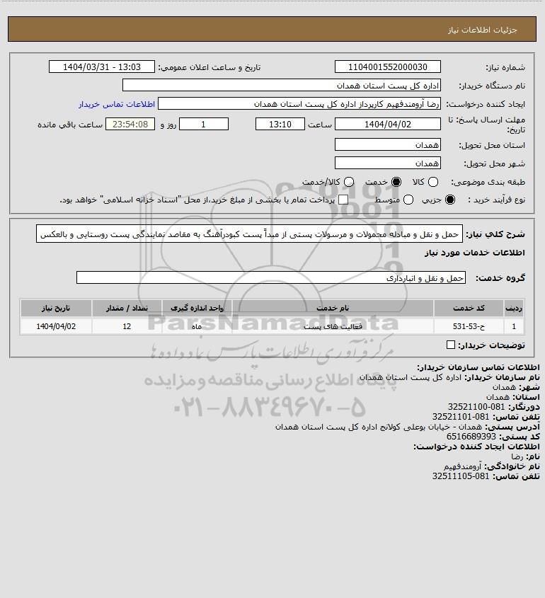 استعلام حمل و نقل و مبادله محمولات و مرسولات پستی از مبداً پست کبودرآهنگ به مقاصد نمایندگی پست روستایی و بالعکس, استعلام حمل و نقل و مبادله محمولات و مرسولات پستی از مبداً پست کبودرآهنگ به مقاصد نمایندگی پست روستایی و بالعکس