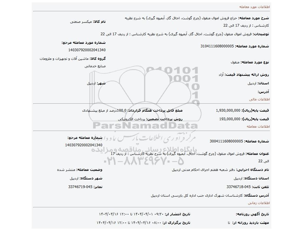 عنوان معامله: فروش اموال منقول (چرخ گوشت، اجاق، آبمیوه گیری) به شرح نظریه کارشناس : از ردیف 17 الی 22