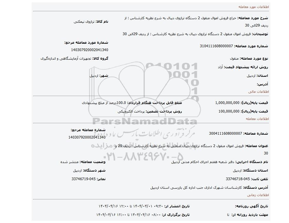عنوان معامله: فروش اموال منقول 2 دستگاه ترازوی دیبال صنعتی به شرح نظریه کارشناس : ردیف 29 و 30 | ||