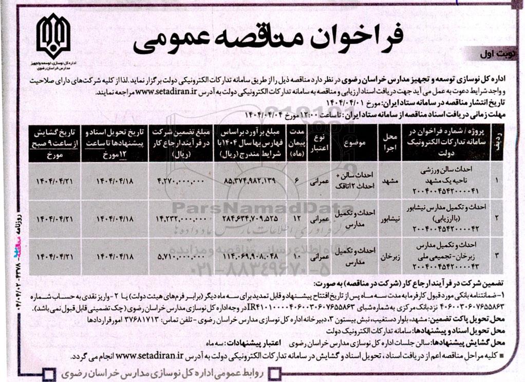 اداره کل نوسازی توسعه و تجهیز مدارس خراسان رضوی در نظر دارد مناقصه ذیل را از طریق سامانه تدارکات الکترونیکی دولت برگزار نماید. لذا از کلیه شرکتهای دارای صلاحیت و واجد شرایط دعوت به عمل می آید جهت دریافت اسناد ارزیابی و مناقصه به سامانه تدارکات الکترونیک دولت به آدرس ستاد ایران مراجعه نمایند.