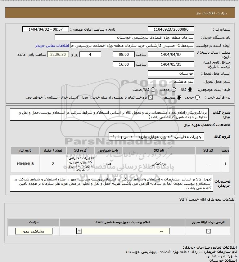 1 -- برد کمکی عدد تجهیزات مخابراتی، کامپیوتر، موبایل، ملزومات جانبی و شبکه 2 1404/04/18