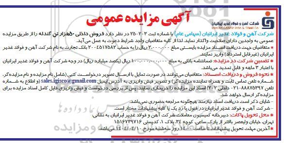 شرکت آهن و فولاد غدیر ایرانیان (سهامی عام) با شماره ثبت 250203 در نظر دارد فروش داخلی 50 هزار تن گندله را از طریق مزایده عمومی به واجدین دارای صلاحیت واگذار نماید. لذا از کلیه متقاضیان واجد شرایط دعوت به عمل می آید.