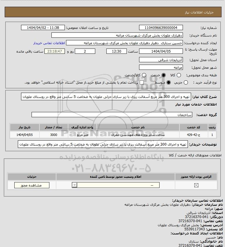 توضیحات خریدار:تهیه و اجرای 300 متر مربع آسفالت ریزی با زیر سازی جزئی علویان به ضخامت 5 سانتی متر واقع در روستای علویان