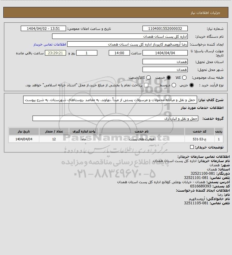 شرح کلی نیاز: حمل و نقل و مبادله محمولات و مرسولات پستی از مبداً .نهاوند. به مقاصد .روستاهای شهرستان. به شرح پیوست