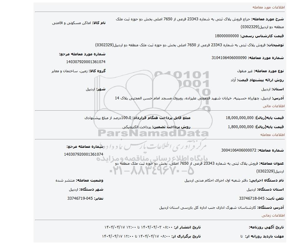 عنوان معامله: فروش پلاک ثبتی به شماره 23343 فرعی از 7650 اصلی، بخش دو حوزه ثبت ملک منطقه دو اردبیل(0302329)