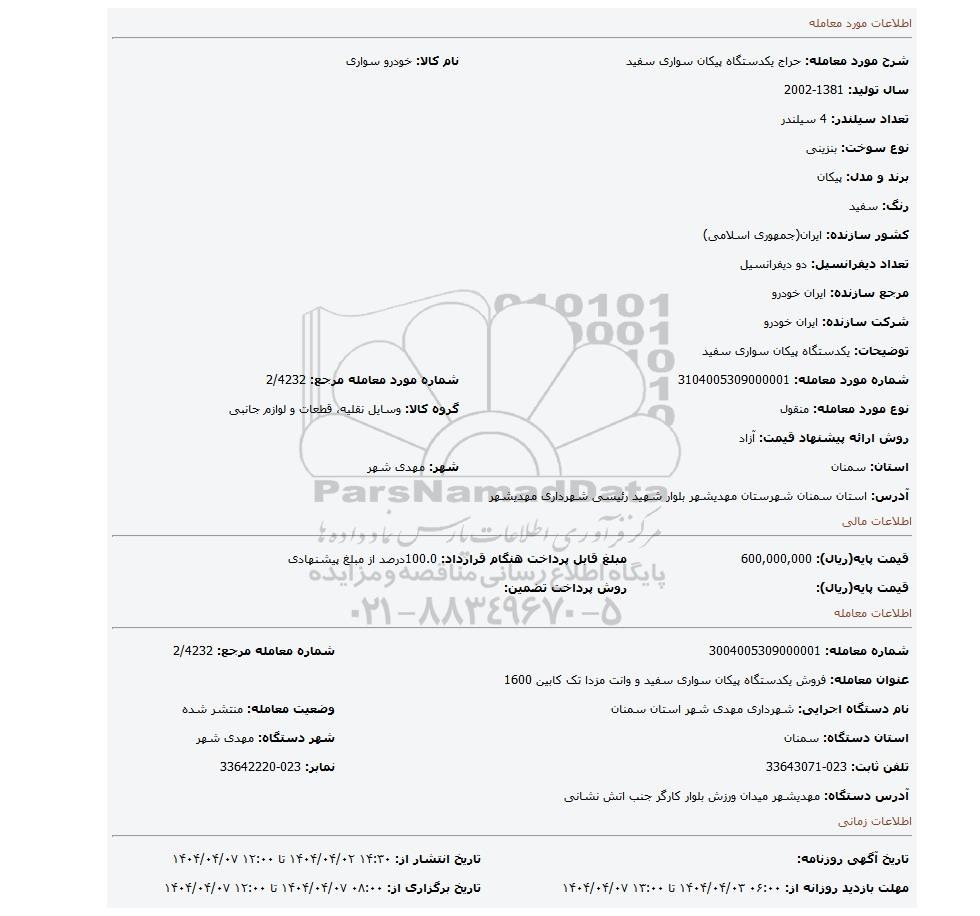 | شرح مورد معامله: حراج یکدستگاه پیکان سواری سفید | نام کالا: خودرو سواری | |