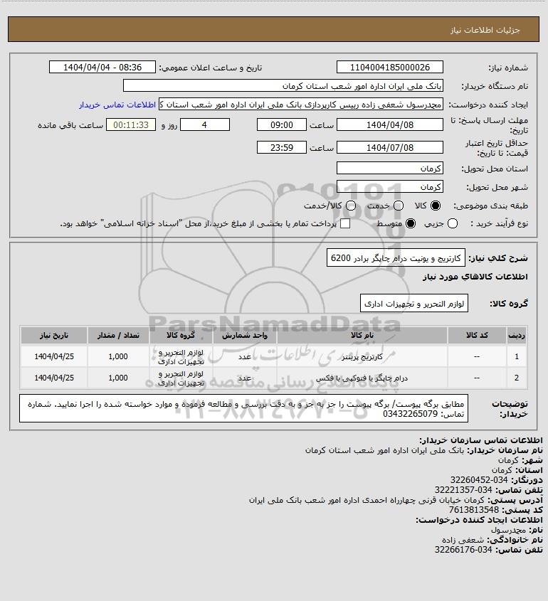 | 2 | -- | درام چاپگر یا فتوکپی یا فکس | عدد | لوازم التحریر و تجهیزات اداری | 1,000 | 1404/04/25 |