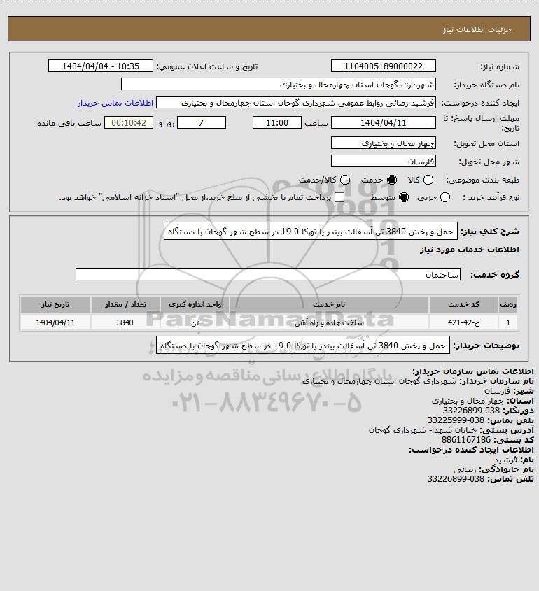 شرح کلی نیاز: حمل و پخش 3840 تن آسفالت بیندر یا توپکا 0-19 در سطح شهر گوجان با دستگاه