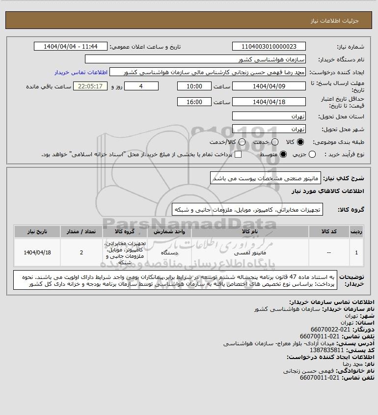 | 1 | -- | مانیتور لمسی | دستگاه | تجهیزات مخابراتی، کامپیوتر، موبایل، ملزومات جانبی و شبکه | 2 | 1404/04/18 |