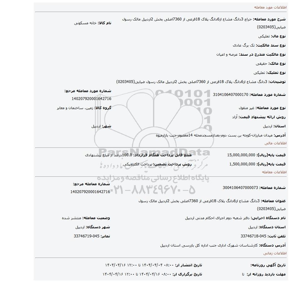 مزایده 3دانگ مشاع از6دانگ پلاک 18فرعی از 7360اصلی بخش 2اردبیل مالک رسول ضیایی(0203405), مزایده، 3دانگ مشاع از6دانگ پلاک 18فرعی از 7360اصلی بخش 2اردبیل مالک رسول ضیایی(0203405)
