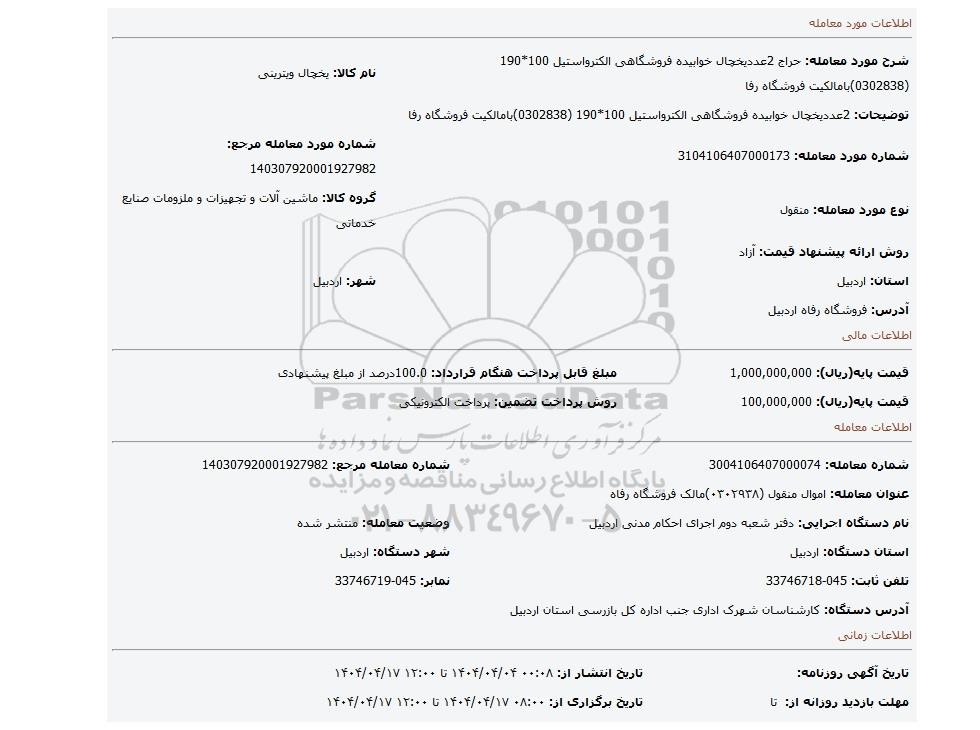 شماره معامله: 3004106407000074 | شماره معامله مرجع: 140307920001927982 | |
