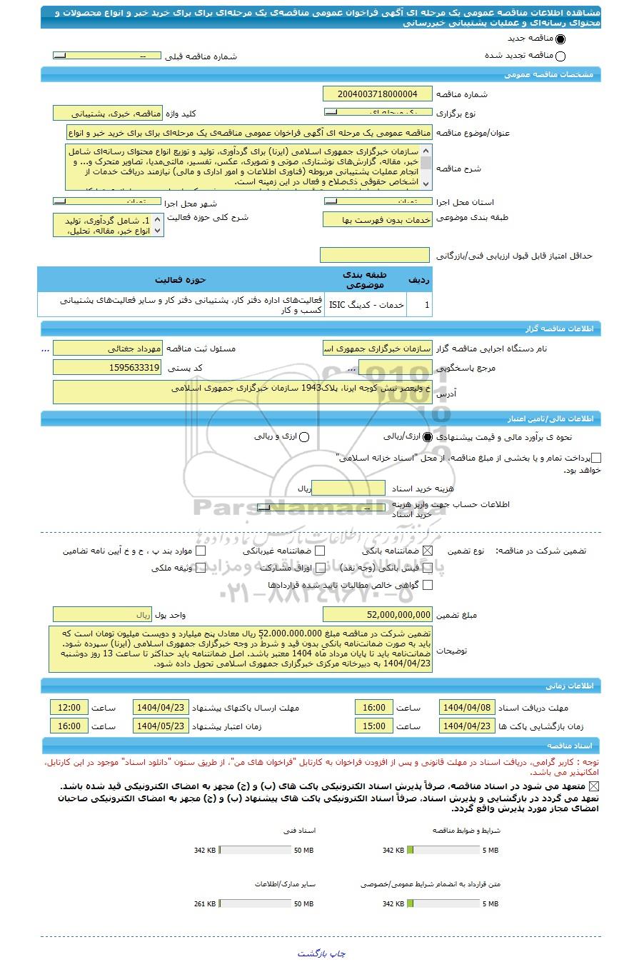| مبلغ تضمین | 52,000,000,000 | واحد پول | ریال |