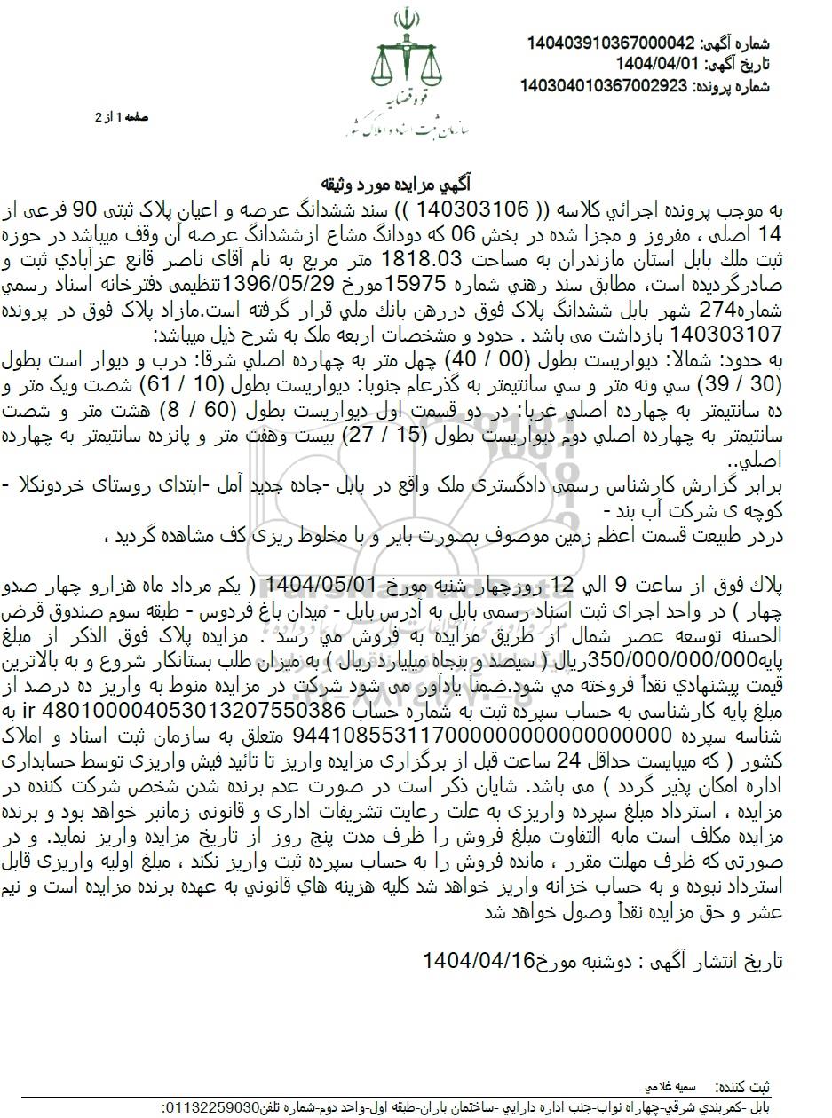 مزایده ششدانگ عرصه و اعیان پلاک ثبتی 90 فرعی از 14 اصلی