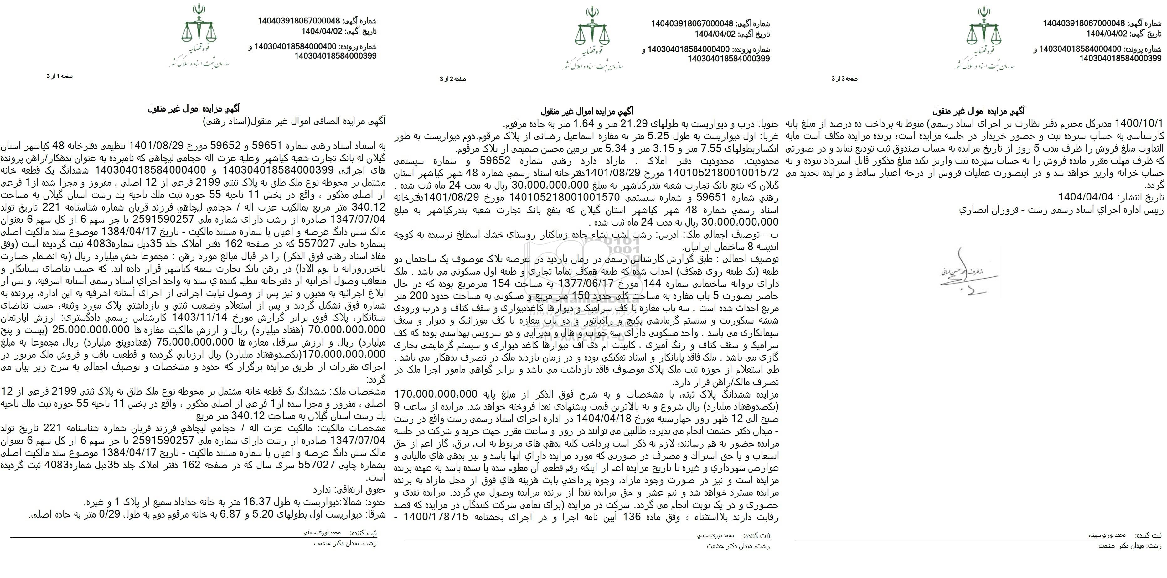 مزایده در تاریخ 1404.4.18 از ساعت 9 صبح الی 12 روز چهارشنبه