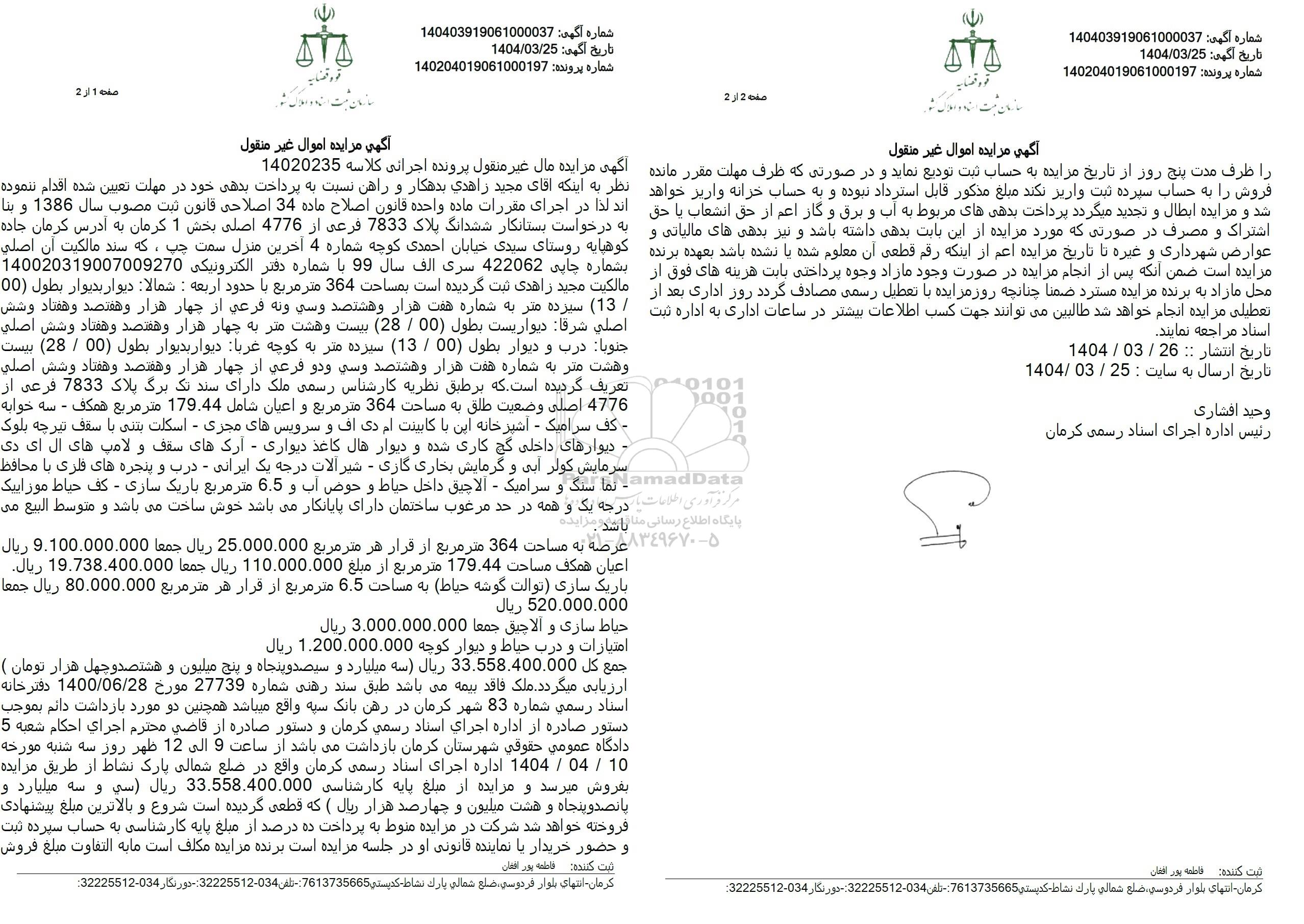 مزایده فروش ششدانگ پلاک 7833 فرعی از 4776 اصلی
