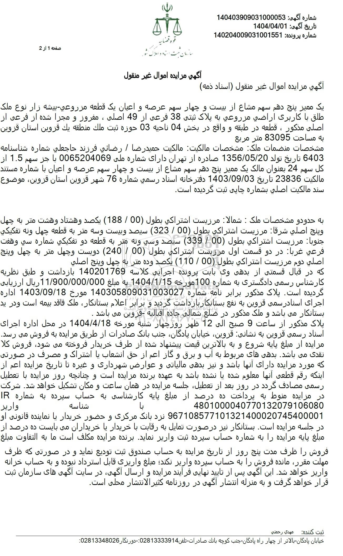 مزایده فروش ملک با کاربری مزرعی به پلاک ثبتی 38 فرعی از 49 اصلی , مزایده فروش ملک با کاربری مزرعی به پلاک ثبتی 38 فرعی از 49 اصلی
