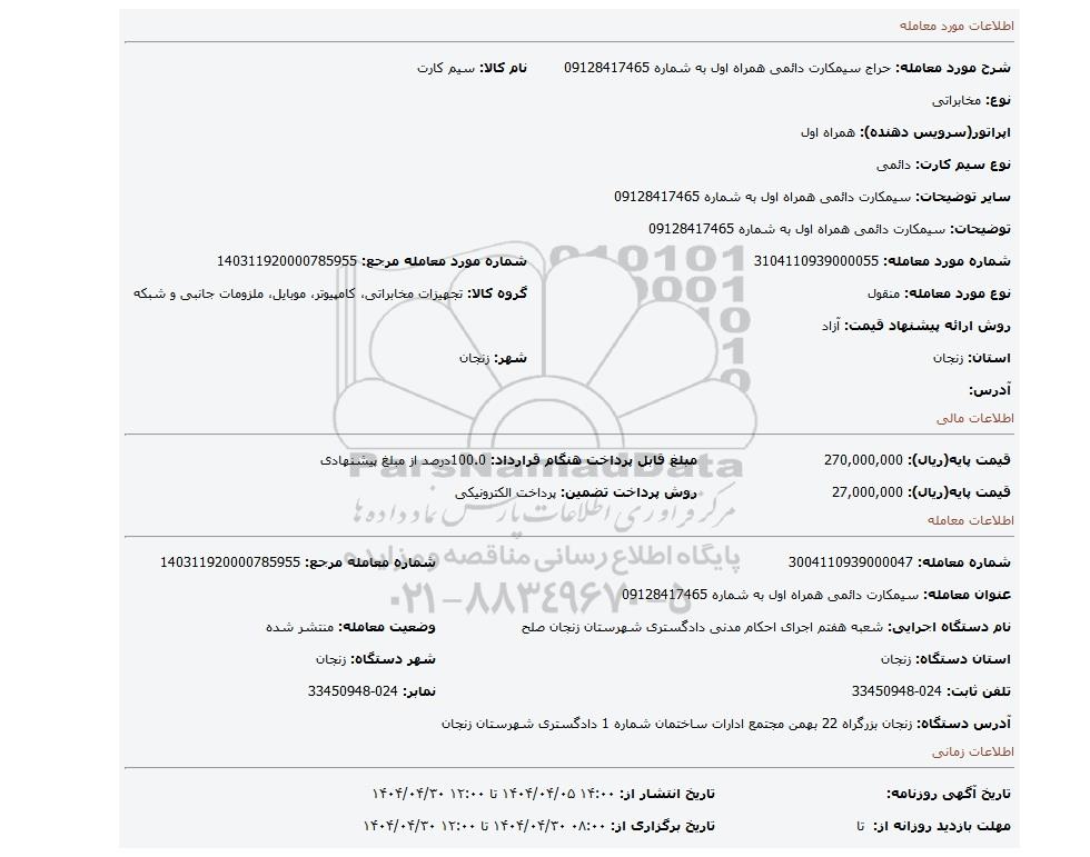 | شرح مورد معامله: حراج سیمکارت دائمی همراه اول به شماره 09128417465 | نام کالا: سیم کارت | |