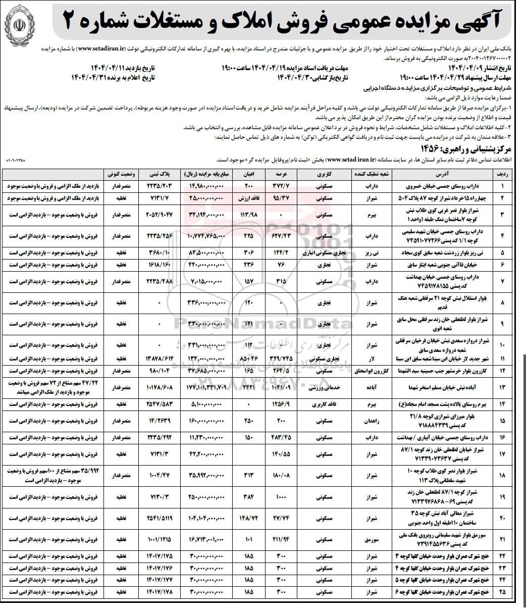 مزایده عمومی مزایده فروش املاک و مستغلات برگزار میگردد. از کلیه افراد متخصص و شرکتهای واجد شرایط دعوت به عمل میآید تا در این مزایده با کد خبرگزاری پارس نماد : 9200288 شرکت نمایند تاریخ شروع مزایده : 1404/04/07 مهلت شرکت در مزایده: تا پایان روز 1404/04/19 مکان برگزاری اموال واگذاری استانهای فارس و دستهبندیهای مربوط به این حراجی املاک و زمین میباشد.