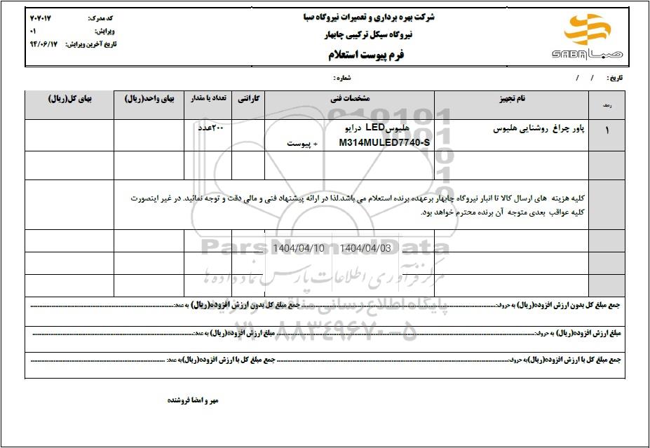 نحوه دریافت اسناد و ارسال پیشنهاد: متقاضیان میتوانند با ثبت نام در سامانه مناقصات و مزایدات ایران (پارس نماد) نسبت به مشاهده اسناد استعلام، دریافت اطلاعات تکمیلی، و ثبت پیشنهاد قیمت خود اقدام نمایند. در صورت نیاز به دریافت راهنمایی یا پشتیبانی در خصوص استعلام و مناقصه و فراخوان مناقصه عمومی، مناقصه محدود، مناقصه بین المللی، مناقصه دولتی، مناقصه خصوصی، مناقصه آنلاین فروش تجهیزات، مناقصه مشاورهای مناقصه پتروشیمی و انرژی مناقصه صنایع و تجهیزات برق و مخابرات و نفت و گاز ... لطفاً با سایت خبری مناقصه و مزایده پارسنماد دادهها به شماره 88349670 تماس حاصل فرمایید.