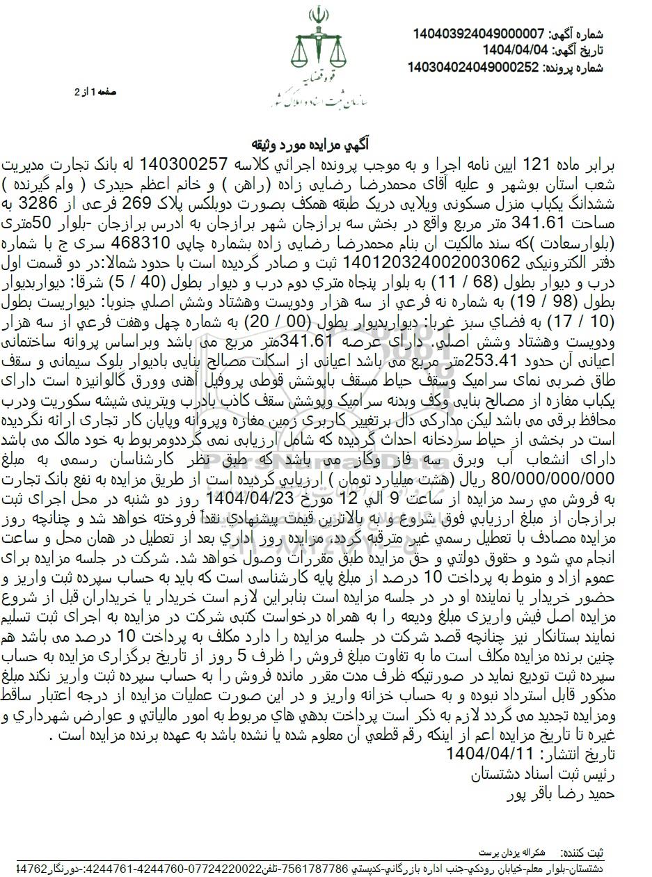 مزایده فروش یکباب خانه به مساحت 341.61 مترمربع پلاک ثبتی 269 فرعی از 3286 واقع در برازجان