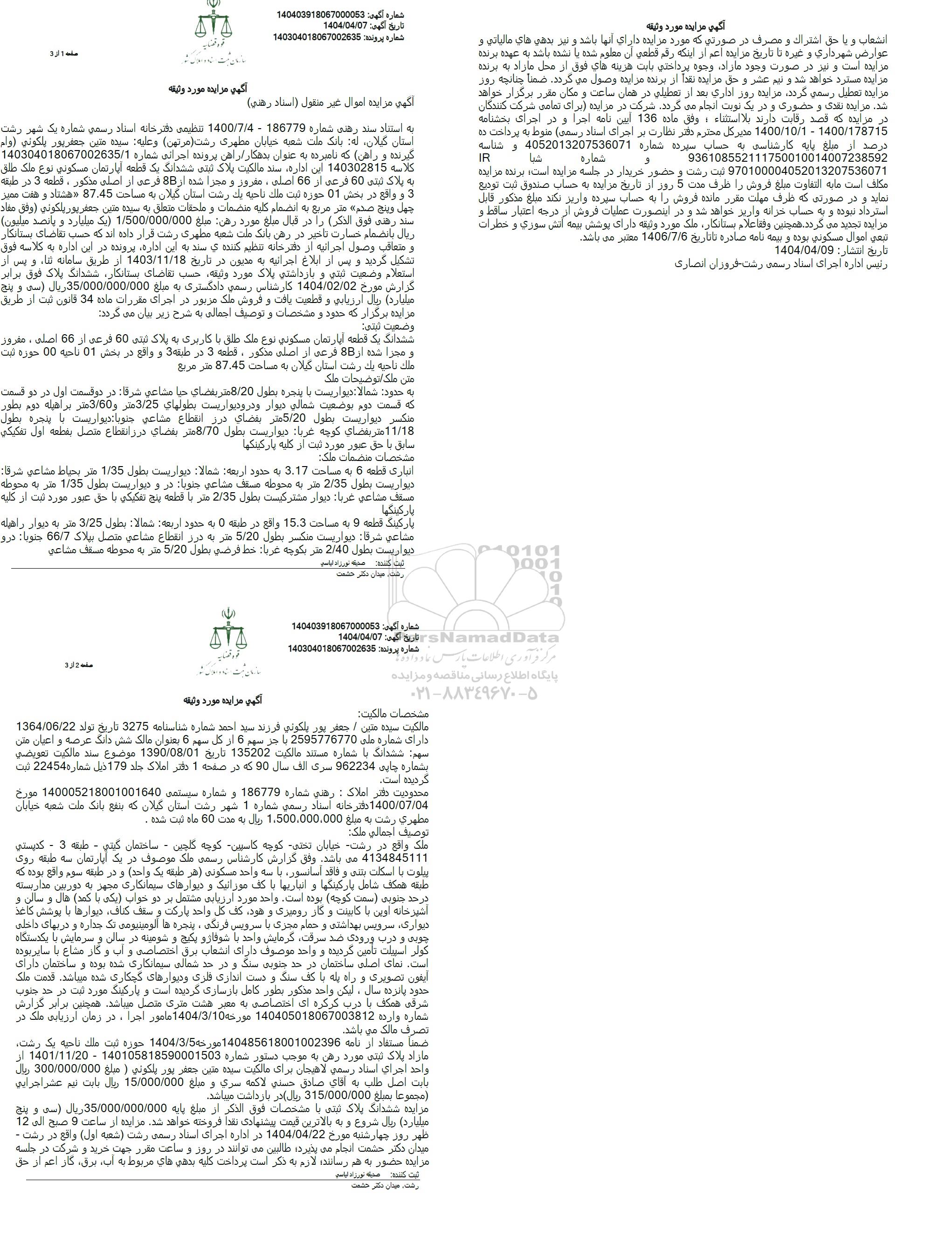 مزایده ششدانگ یک قطعه آپارتمان مسکونی به پلاک ثبتی 60 فرعی از 66 اصلی