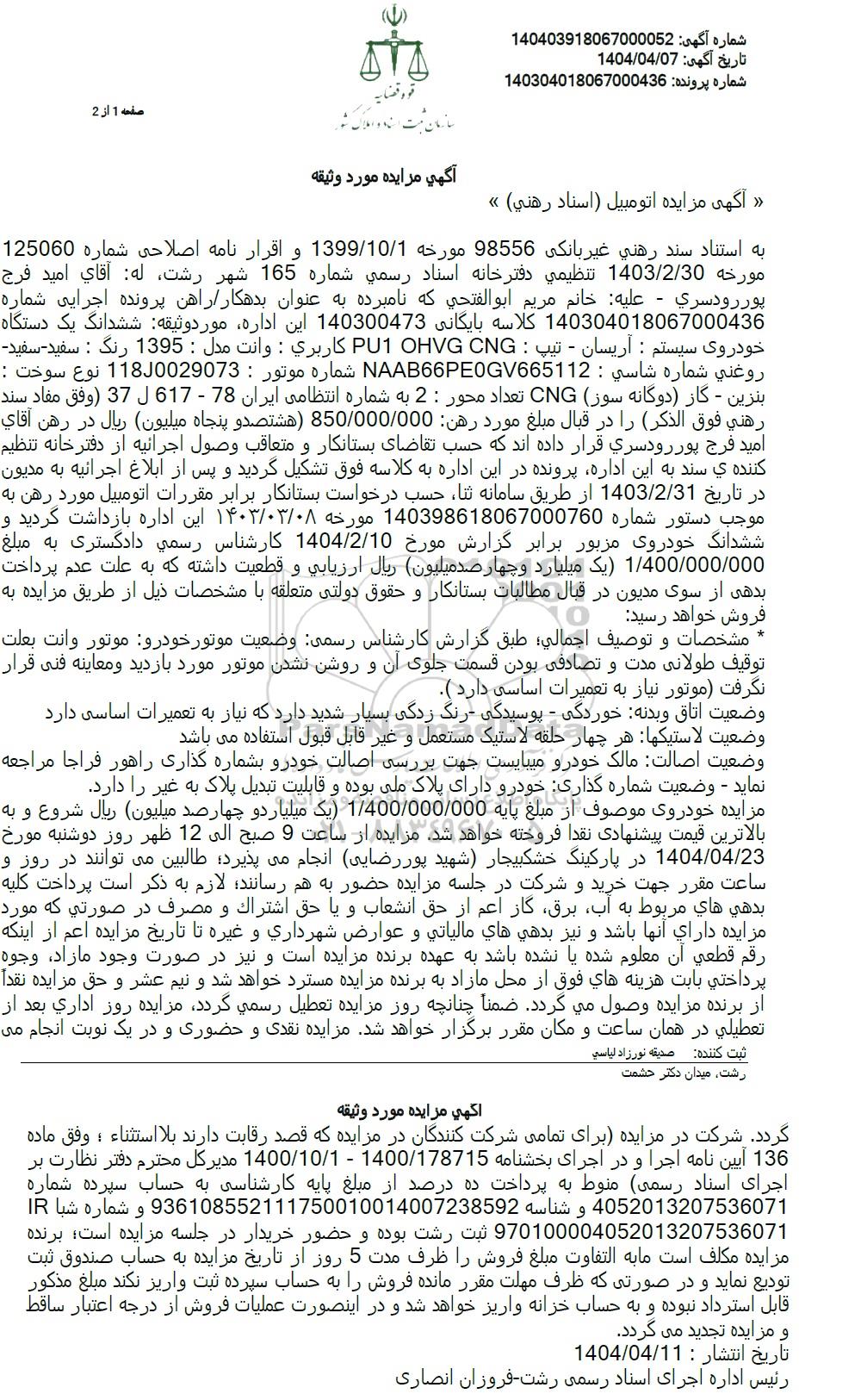 مزایده ششدانگ یک دستگاه خودروی سیستم آریسان , مزایده ششدانگ یک دستگاه خودروی سیستم آریسان