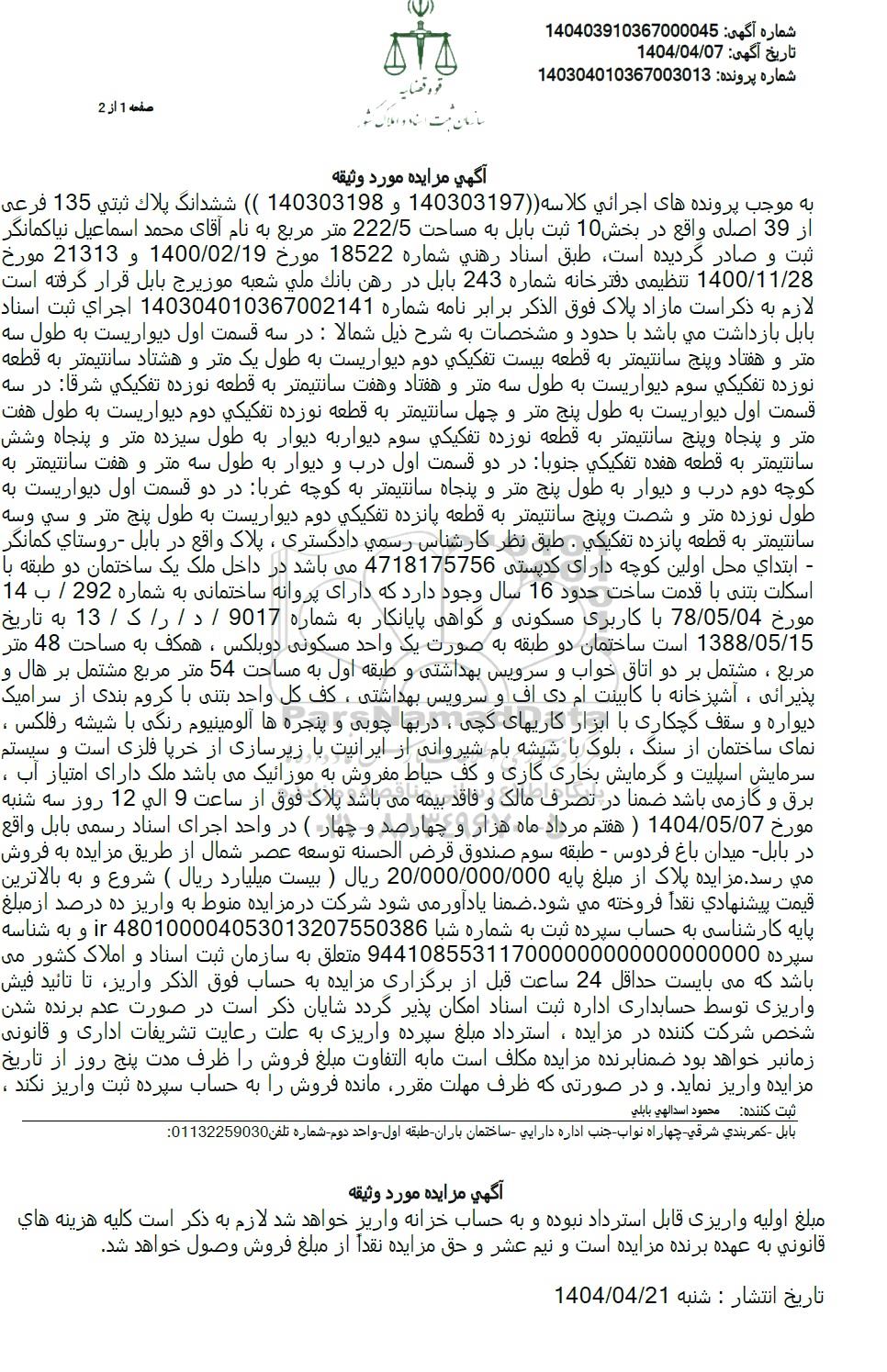 شماره آگهی : 140403910367000045