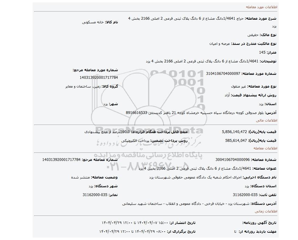 مزایده 1/4641دانگ مشاع از 6 دانگ پلاک ثبتی فرعی 2 اصلی 2166 بخش 4 یزد, مزایده، 1/4641دانگ مشاع از 6 دانگ پلاک ثبتی فرعی 2 اصلی 2166 بخش 4 یزد