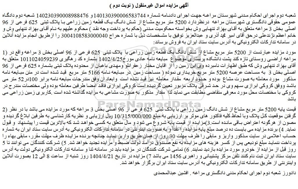 شعبه دوم اجرای احکام مدنی شهرستان مراغه جهت اجرای دادنامه شماره 140130390006583744و 140230390008988476 شعبه دوم دادگاه عمومی حقوقی دادگستری شهرستان مراغه درنظردارد 5200 متر مربع مشاع از شش دانگ یک قطعه زمین زراعی با پلاک ثبتی 625 فرعی از 96 اصلی بخش 3 مراغه متعلق به آقای بهزاد تنهایی وش بخواسته محکومیت مدنی (حکم به پرداخت وجه نقد ) محکوم علیهم به نام آقای بهزاد تنهایی وش و خانم اعظم نژندعلی درحق آقای امیر محمد آذری و عبدالعزیز توفیق با مشخصات ذیل با شماره حراج 3004108583000040 را ازطریق انجام مزایده آنلاین در سامانه تدارکات الکترونیکی به آدرس سایت ستاد ایران به فروش برساند: