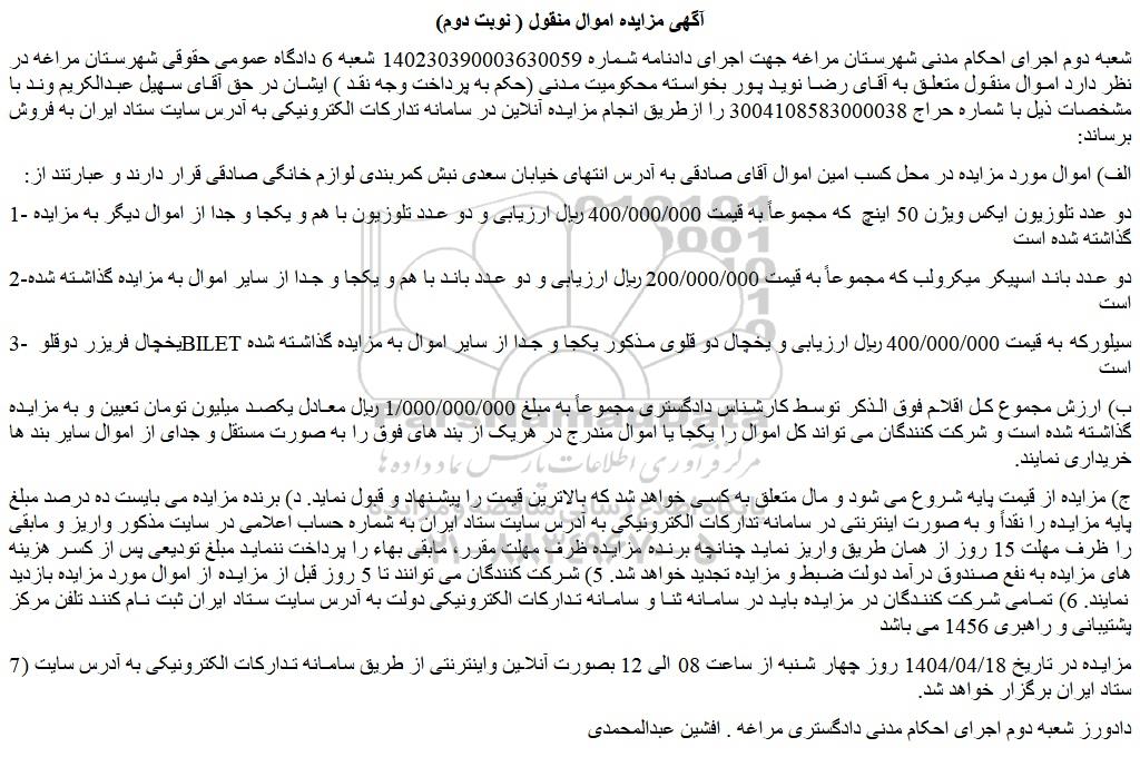 شعبه دوم اجرای احکام مدنی شهرستان مراغه جهت اجرای دادنامه شماره 140230390003630059 شعبه 6 دادگاه عمومی حقوقی شهرستان مراغه در نظر دارد اموال منقول متعلق به آقای رضا نوید پور بخواسته محکومیت مدنی (حکم به پرداخت وجه نقد ) ایشان در حق آقای سهیل عبدالکریم وند با مشخصات ذیل با شماره حراج 3004108583000038 را ازطریق انجام مزایده آنلاین در سامانه تدارکات الکترونیکی به آدرس سایت ستاد ایران به فروش برساند:
